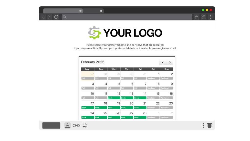 Your booking URL will be a unique link generated through Mechanic Desk, in this format: yourworkshop.bookmymechanic.com.au.